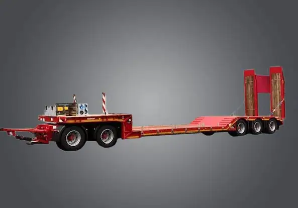 4 axlig maskinvagn , transport av höga-skrymmande entreprenadmaskiner, breddbart lastutrymme- lågbädd, hydrauliska påkörningsramper.