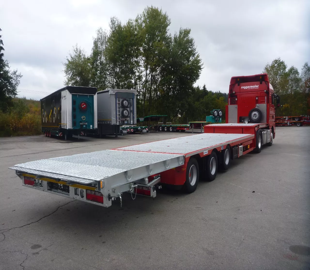 4 axlar GW 58 ton, Tungt långt gods och tunga maskiner Påkörningsramper, hjulfickor med täcklock, medstyrande axlar